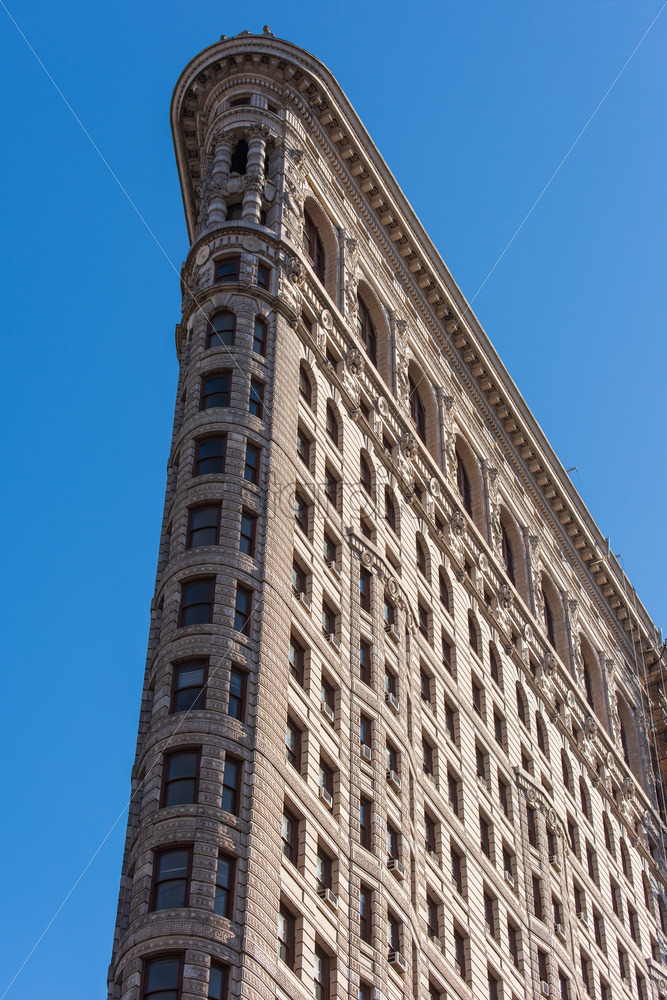 Close view of the Flatiron Building facade in New York downtown, USA