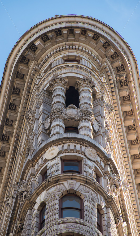 Close view of the Flatiron Building facade in New York downtown, USA