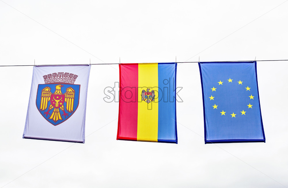Home » Shop » objects » View from bottom to city coat of arms, country and Europe flag at local festival. Negative copy space, place for text. Chisinau, moldova