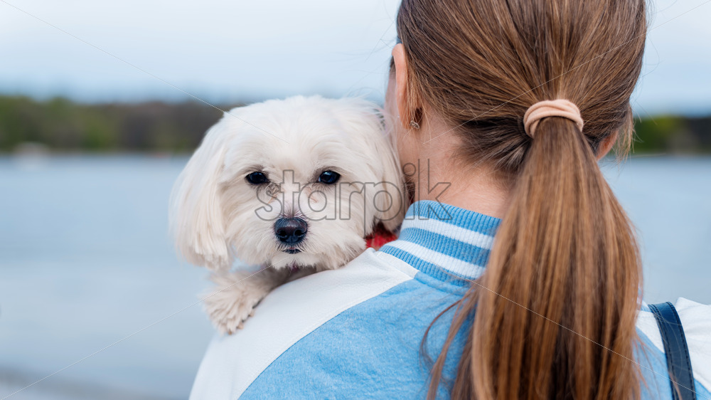 Home » Shop » photo » View of a blonde woman holding her maltese dog with white fur, lake on the background