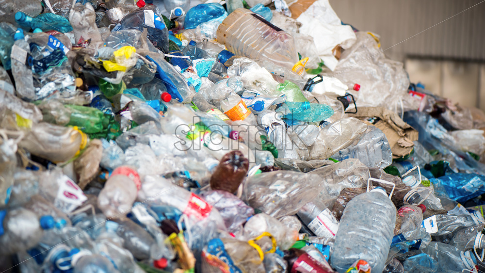 Panoramic view of interior of a waste sorting plant. Cubes of compressed plastic garbage, special tools