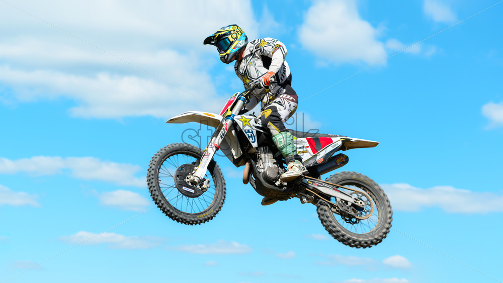 CHISINAU, MOLDOVA – SEPTEMBER, 2022: View of a jumping motorcyclist at a motocross race, mud track, rally motorcycle, sky on the background