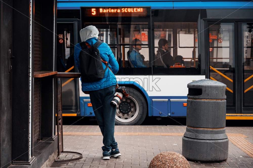 View of a man waiting on the bus station in Chisinau, Moldova. Trolleybus on the background