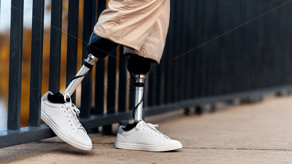 Vertical view of a man with prosthetic legs and white sneakers. Rested one foot on the fence