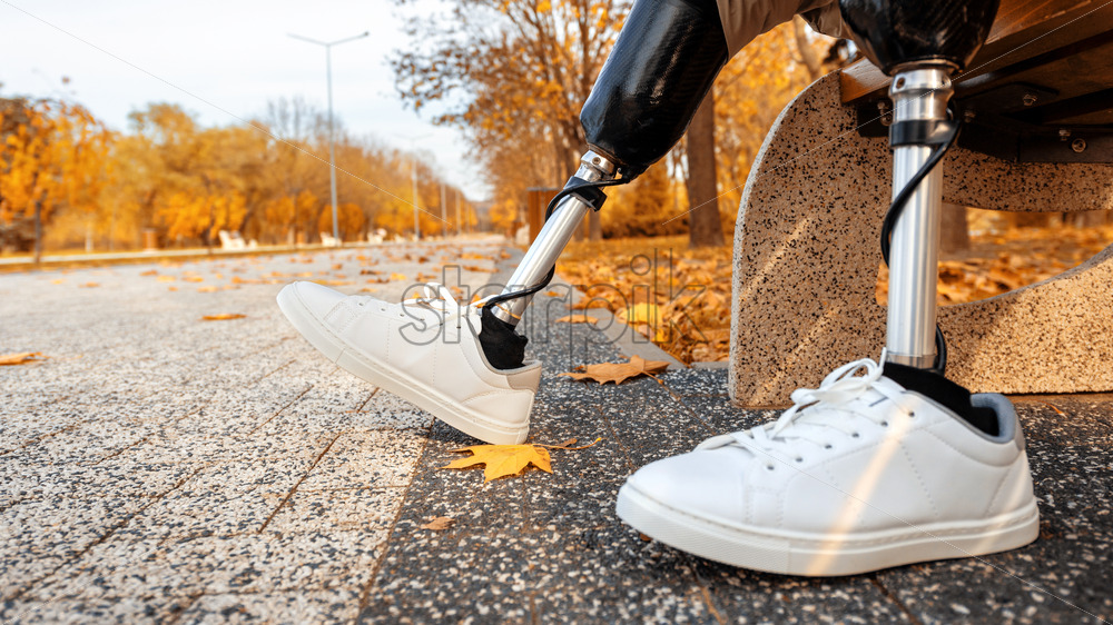Home » Shop » photo » View of a man with prosthetic legs and white sneakers. Sitting on a bench in a park. Fallen yellow leaves around