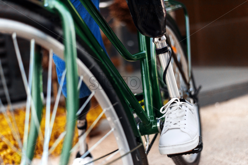Slow motion view of a man with prosthetic legs. Walking with a bicycle on the street and stops, out of focus effect Download royalty free stock video footage Royalty Free Stock Video Footage