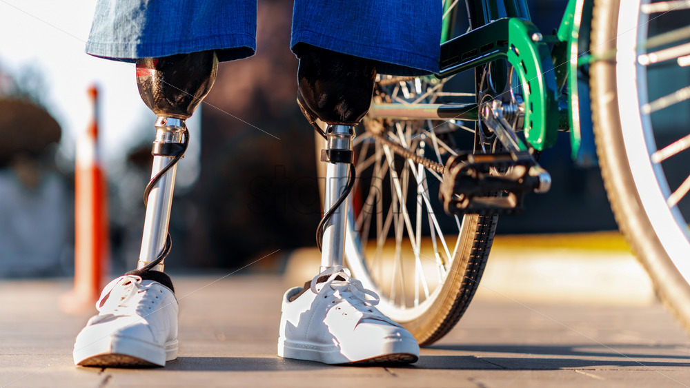 View of a man with prosthetic legs and white sneakers making a step, blue background Download royalty free stock video footage Royalty Free Stock Video Footage