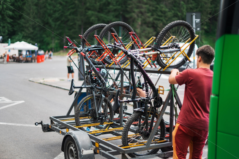 Home » Shop » photo » View of a mobile vertical bicycle parking with a man nearby in Brasov, Romania