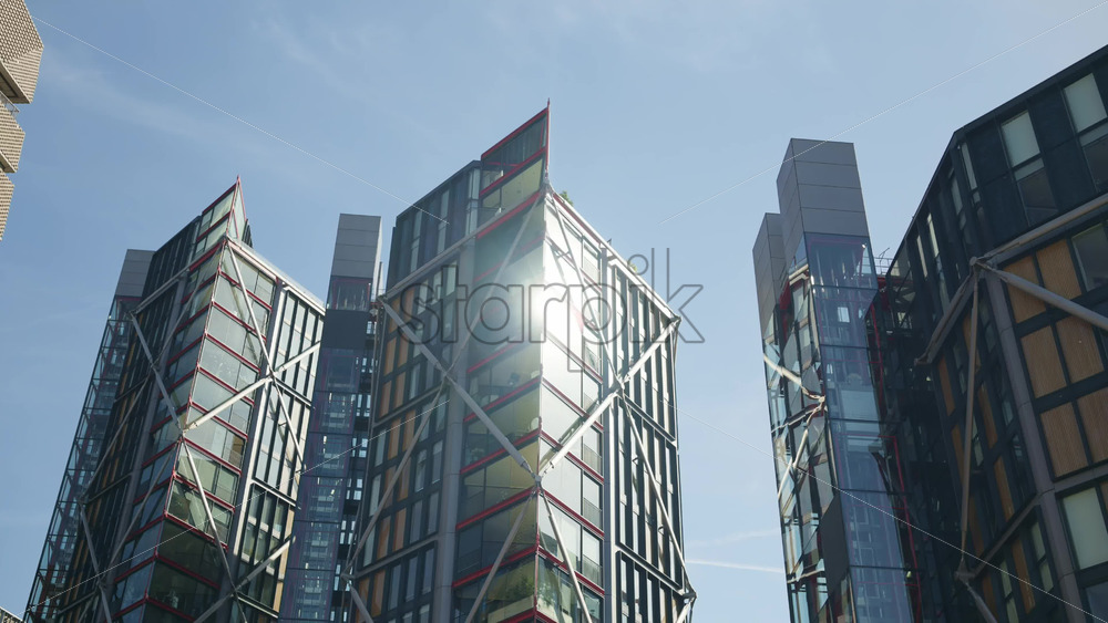 View of a modern glass office buildings in London, England with sunlight reflecting off windows Royalty Free Stock Video Footage