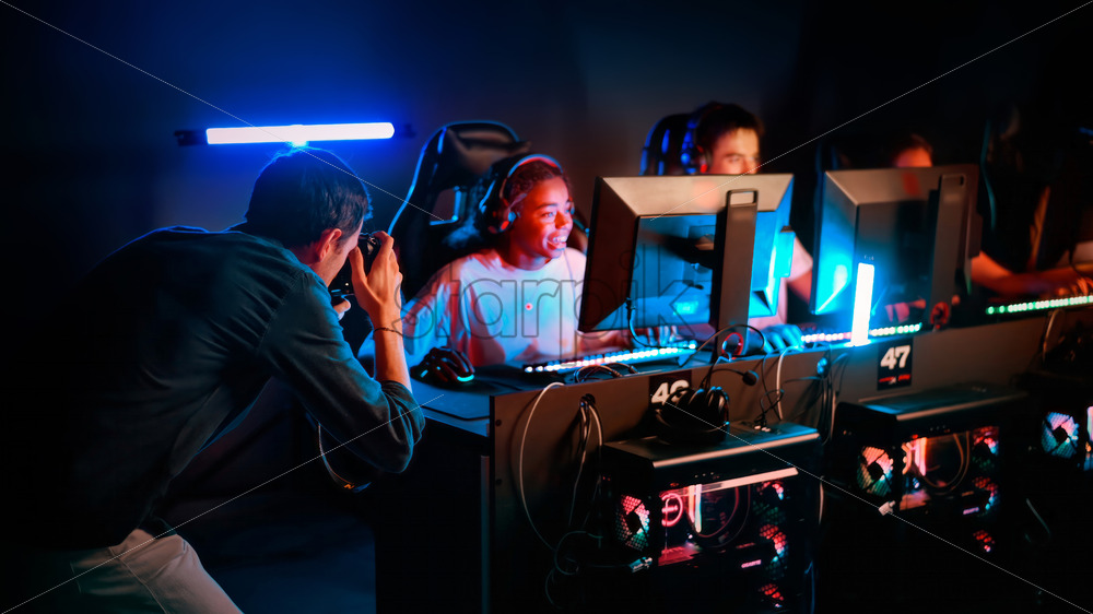 View of a professional photographer filming teens in headsets playing video games in video game club with blue illumination