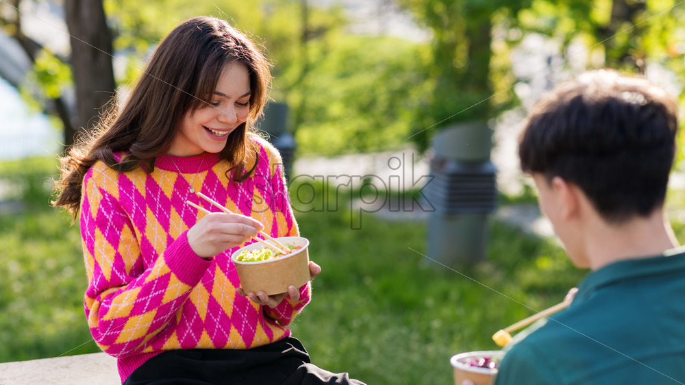 Portrait of a young smiling woman eating poke bowl with vegetables and fruits using chopsticks while sitting in smartphone. Park with a lot of greenery and illumination