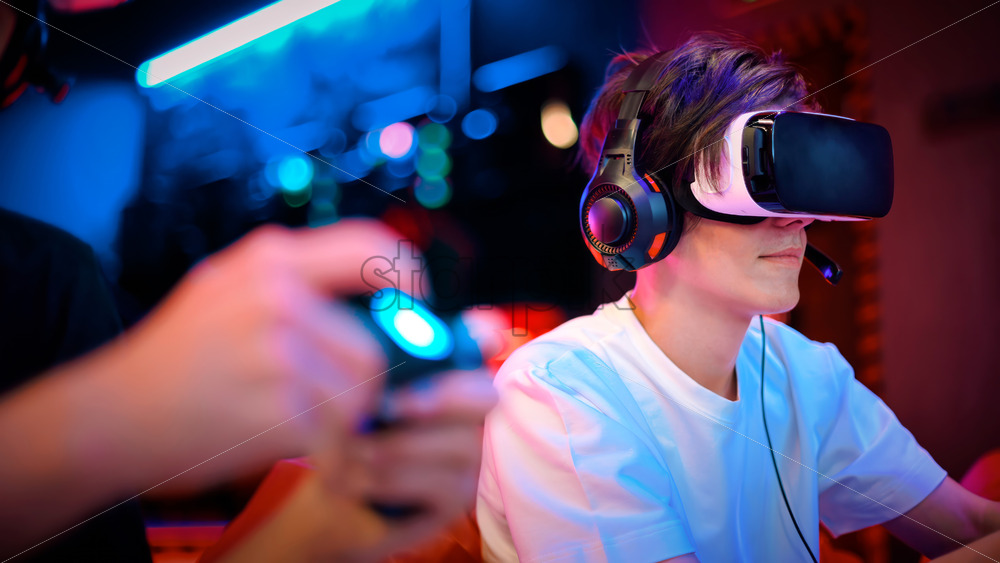 Home » Shop » photo » View of a teen playing a game console in headphones and VR headset using gamepad while sitting on bean bag. Blue and red illumination