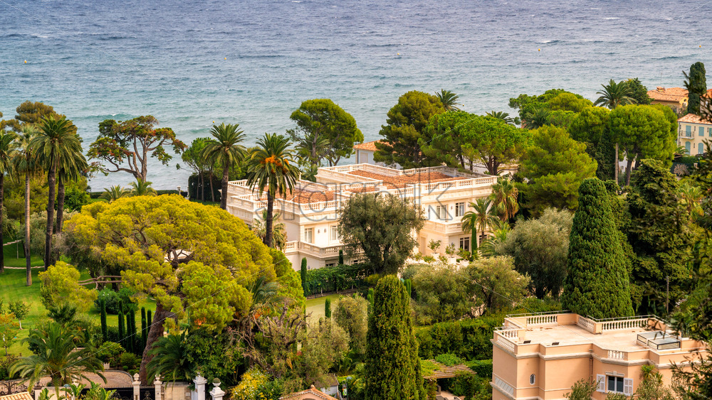View of the Villa Ephrussi de Rothschild with garden full of greenery in Saint-Jean-Cap-Ferrat, France