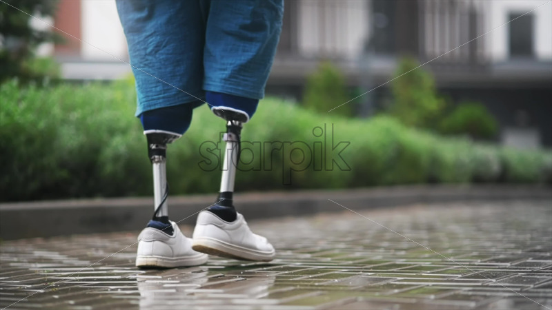 Home » Shop » city » Video – View of a walking man with prosthetic legs and white sneakers at rainy weather, greenery on the background