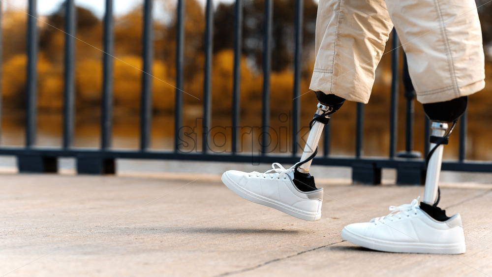 View of a walking man with prosthetic legs and white sneakers. Fallen yellow leaves on the ground