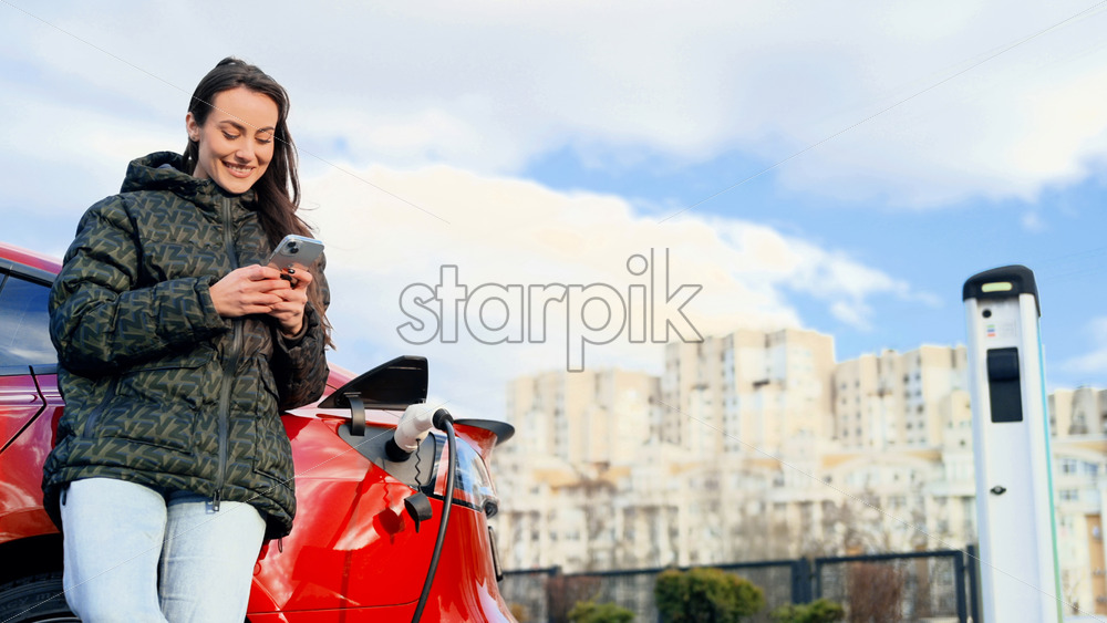 Home » Shop » photo » View of a woman using smartphone near her charging red electric car