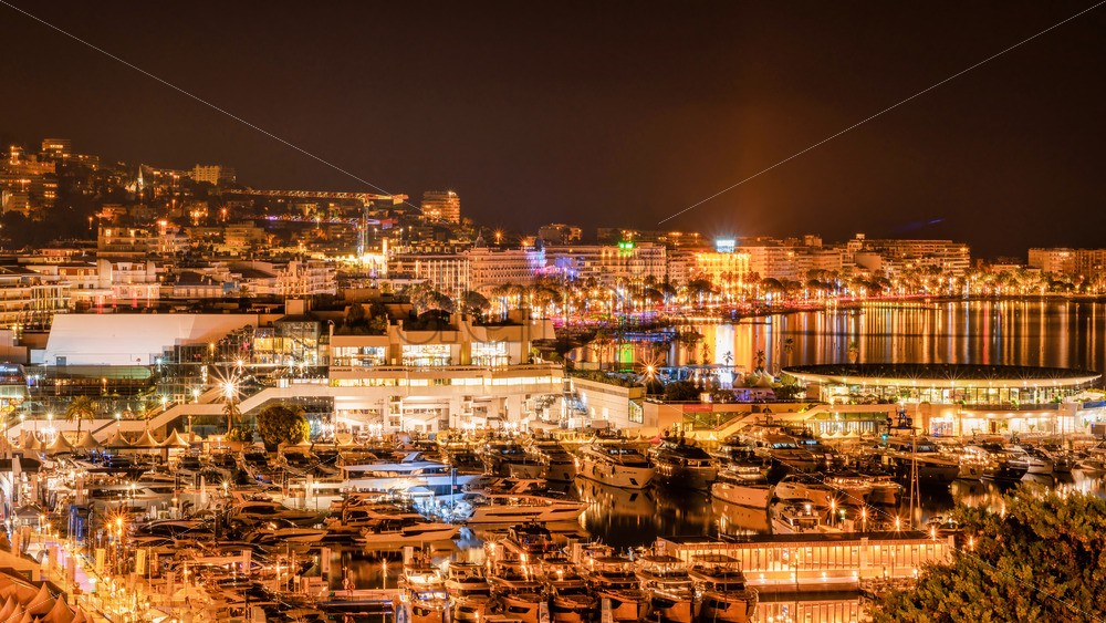 CANNES, FRANCE – SEPTEMBER 7, 2021: View of the town at night. Beuldings, nightlights, moored yachts