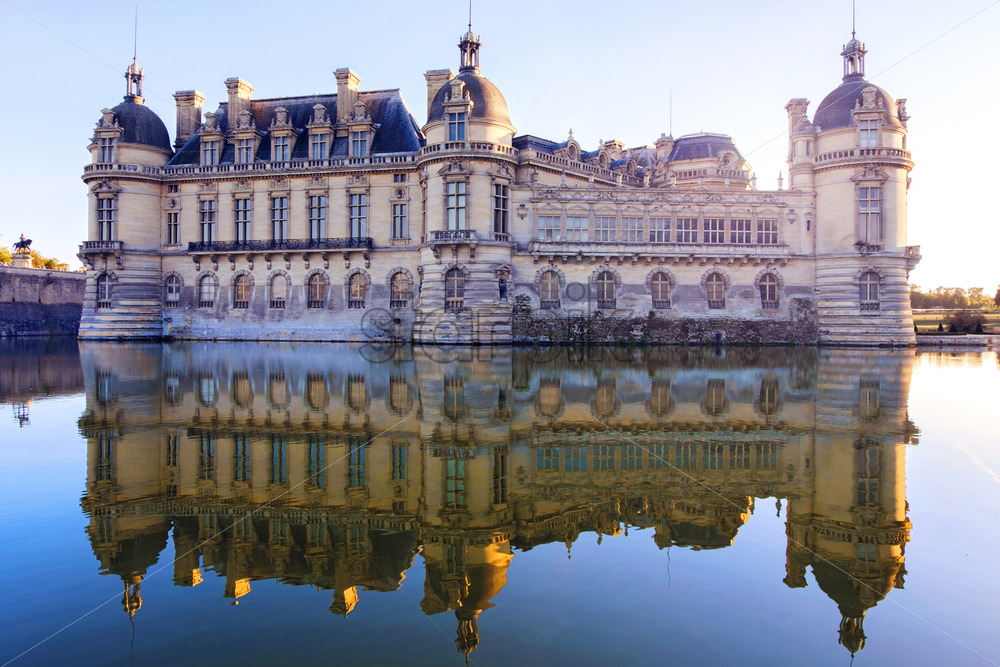 CHANTILLY, FRANCE – 4 OCTOBER 2018: Interior of Chantilly castle museum. Hall with stairs is decorated with paintings, sculptures and columns Royalty Free Stock photo