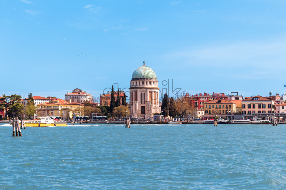 Daylight view from bridge to local canal with parked marine police boats and tall city buildings. Bright blue clear sky reflecting on water. Negative copy space, place for text. Venice, Italy
