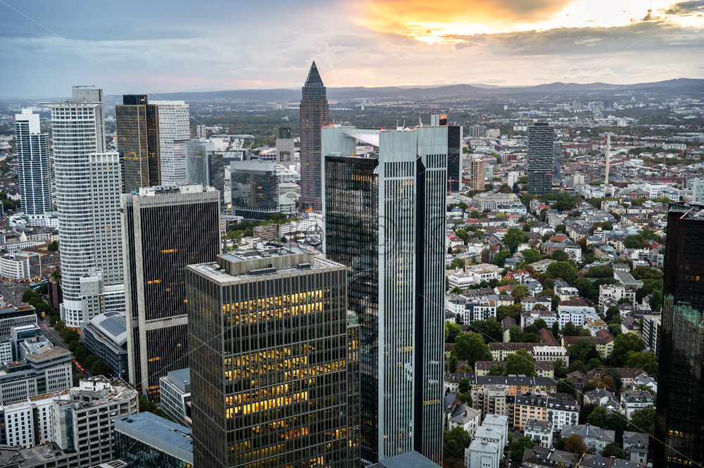 View of Frankfurt from a skyscraper at sunset, Germany. Multiple skyscrapers and residential buildings