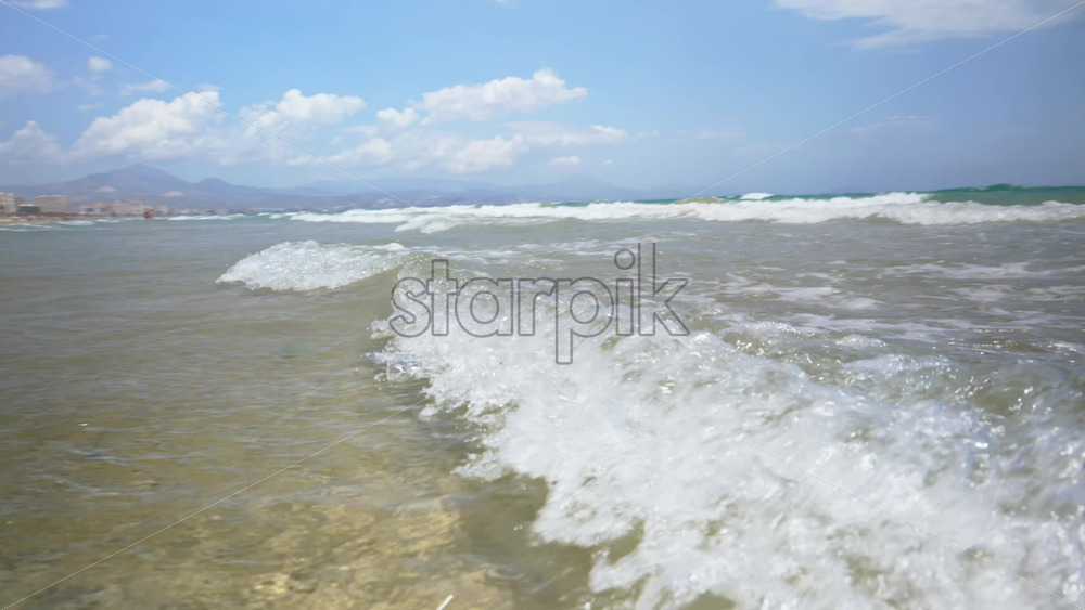 Aerial drone view of waves hitting the shore on the beach in Alicante, Spain. Vertical Royalty Free Stock Video Footage