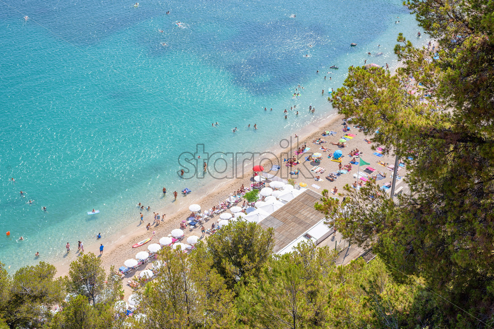 View of luxury resort villefranche sur mer and bay on french riviera at mediterranean sea Cote d’Azur in France. Blue water with people relaxing and swimming.