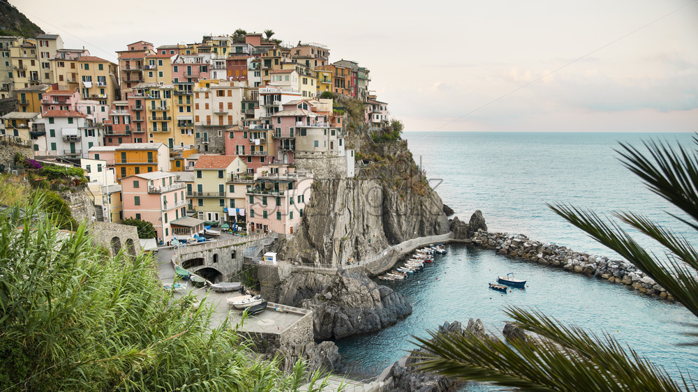 View of Manarola at sunset, located on the Ligurian sea coast, Italy. Rows of residential buildings, greenery