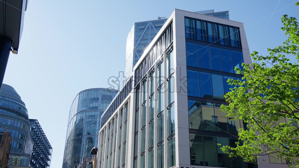 View of modern glass office buildings in London, England with sunlight reflecting off windows and tree branches Royalty Free Stock Video Footage