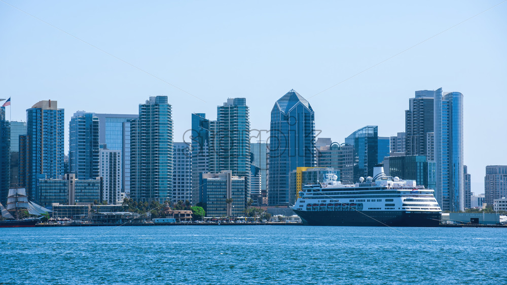 Home » Shop » photo » View of San Diego downtown from the water, moored ship, modern skyscrapers, USA