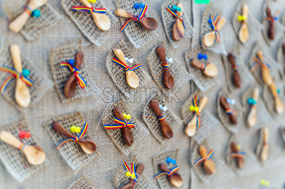View of selling handmade national small wooden spoons in Village Museum in Bucharest, Romania