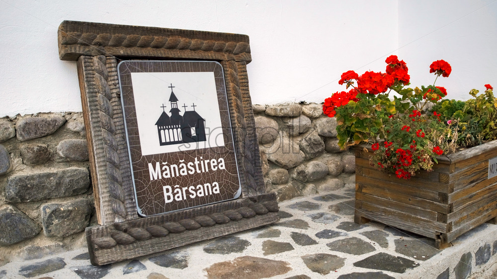View of the Barsana Monastery sign on the ground, flowers near it, Romania