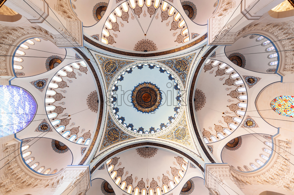 View of the Camlica Mosque in Istanbul at evening, Turkey. Facade made of white stone, illumination, few people in front of it Royalty Free Stock Video Footage