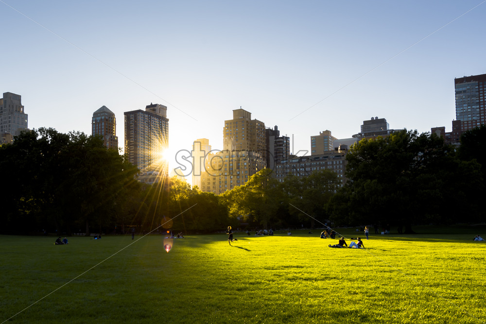 NEW YORK, USA – SEPTEMBER, 2019: View of the Central Park in city downtown. Lawn with resting people, a lot of greenery, skyscrapers