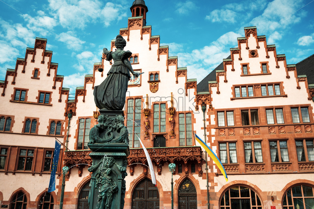 View of the City Hall at Roemerberg in Frankfurt, Germany. Square with fountain in front of it