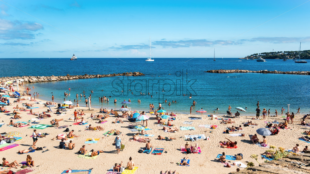 ANTIBES, FRANCE – AUGUST 30, 2021: View of the cote d’Azur. Multiple resting on the beach people, yachts, blue water of the Mediterranean sea