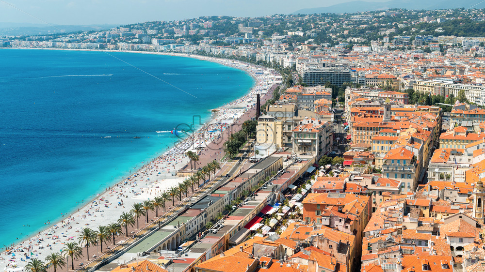 View of the cote d’Azur in Nice, France. Multiple resting on the beach people, buildings, blue water of the sea, hills on the background