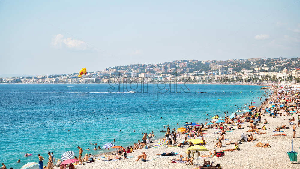 NICE, FRANCE – AUGUST 8, 2021: View of the cote d’Azur. Multiple resting on the beach people, buildings, blue water of the Mediterranean sea