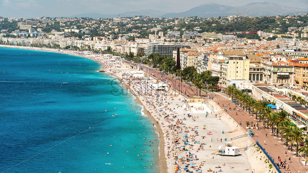 View of the cote d’Azur in Nice, France. Multiple resting on the beach people, buildings, blue water of the Mediterranean sea