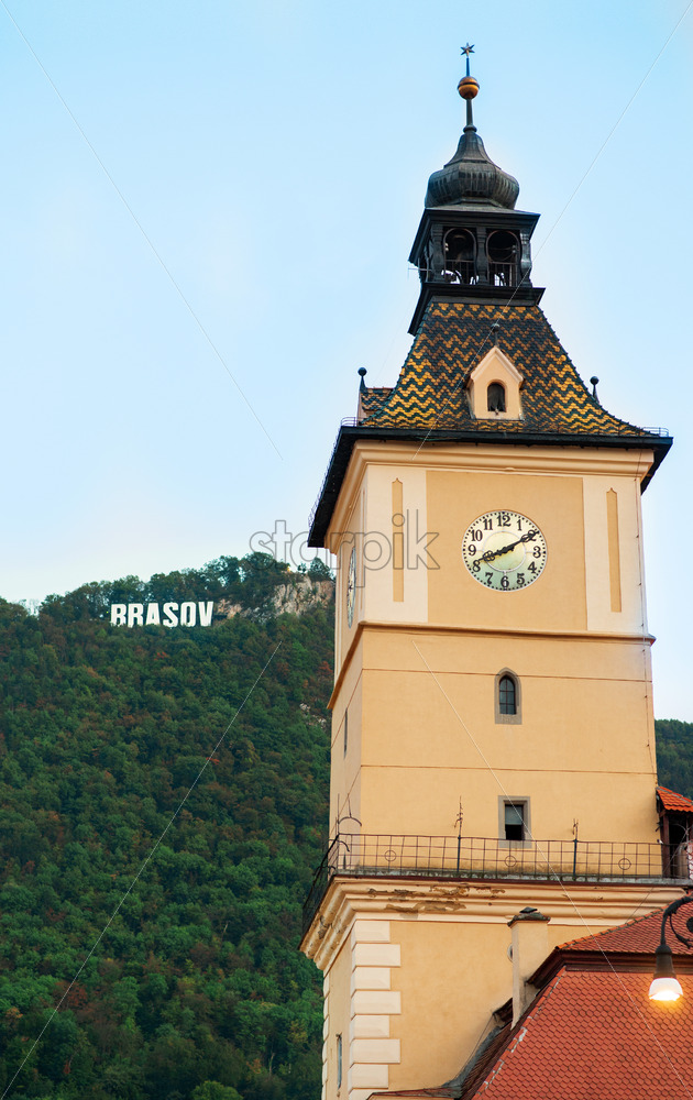 View of the County Museum in old Brasov centre, Romania. Hill with greenery and city sign on the background