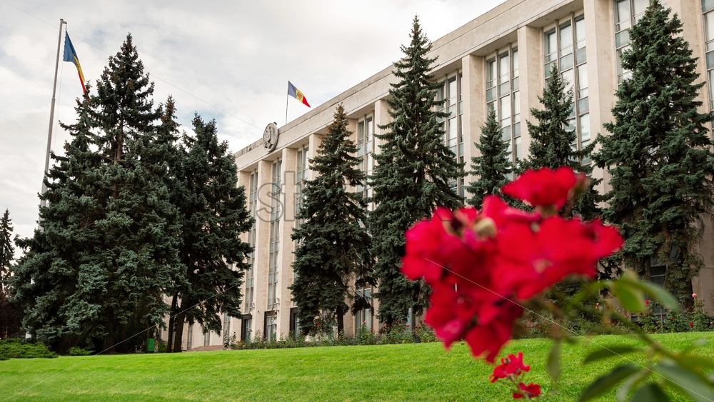 View of the Government House in Chisinau, Moldova. Flowers and greenery on the foreground