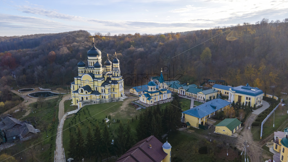 View of the Hancu Monastery from the drone. Churches, other buildings and green lawns. Hill with bare trees near it. Moldova
