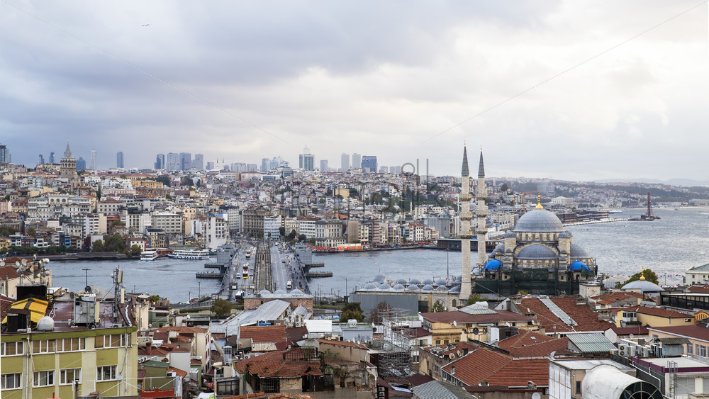 Home » Shop » photo » View of the Istanbul at cloudy weather, Bosphorus strait dividing city into two parts, multiple buildings, New Mosque and bridge with cars, Turkey