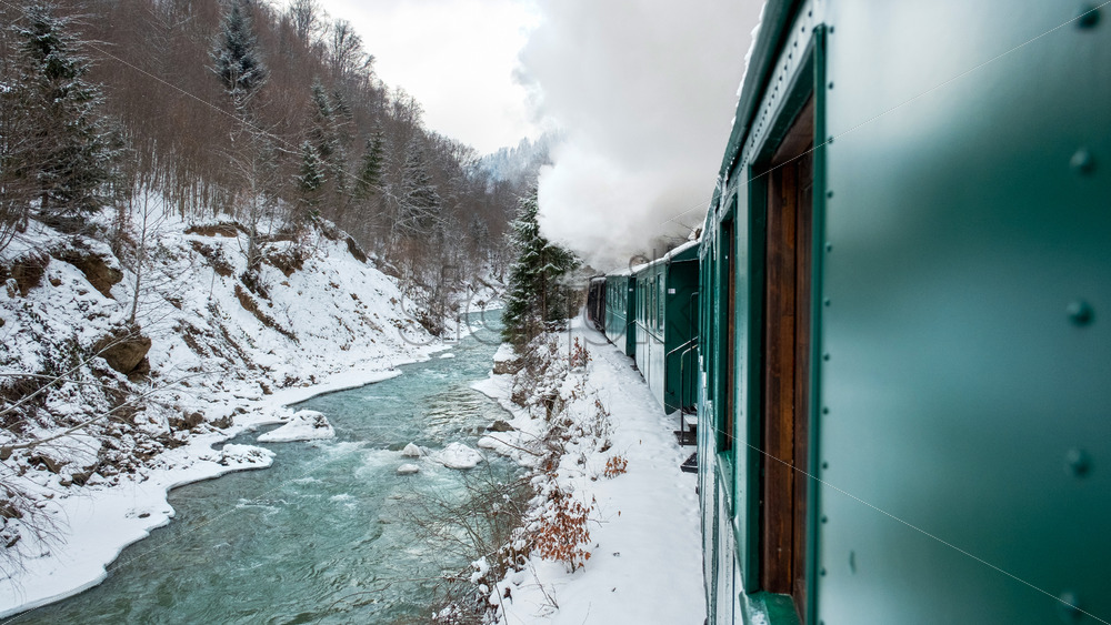 Home » Shop » photo » View of the moving steam train Mocanita from inside it, bare forest and river in winter, snow, Romania