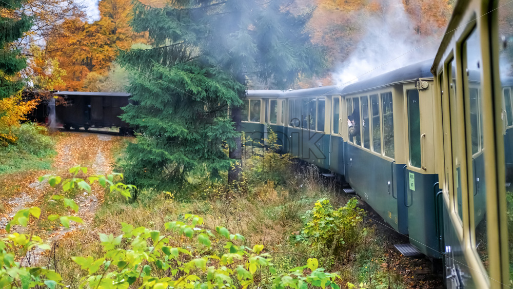 View of the moving steam train Mocanita from inside it, yellowed forest, Romania