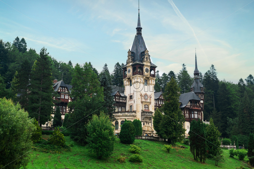 Home » Shop » photo » View of The Peles Castle in Romania. Castle with gardens and tourists in Carpathians, lush forest around it