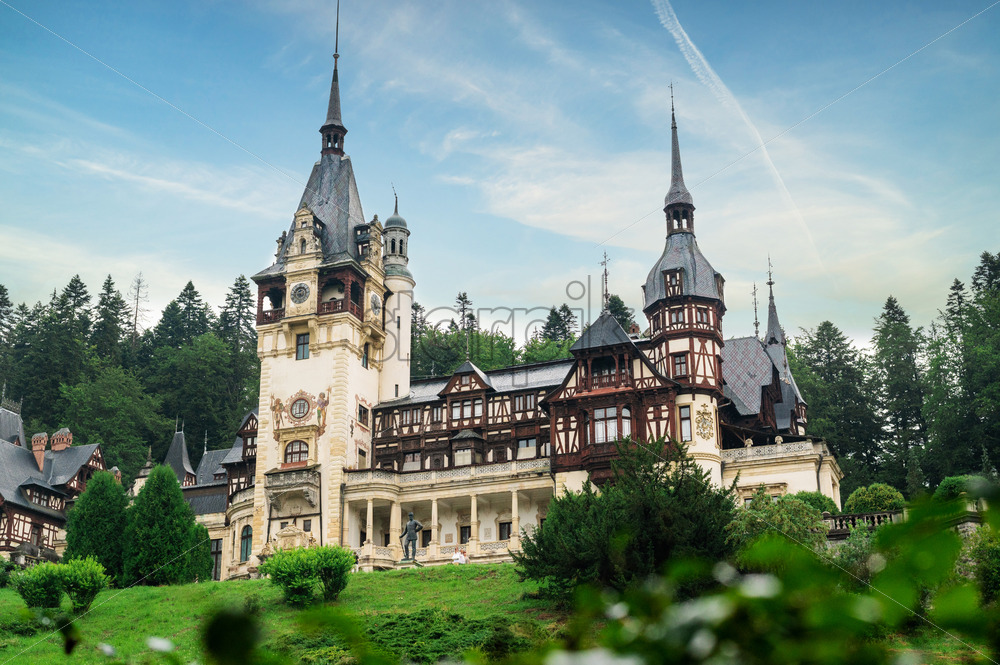 View of The Peles Castle in Romania. Castle with gardens and tourists in Carpathians, lush forest around it