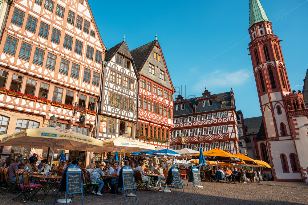 FRANKFURT, GERMANY – SEPTEMBER, 2022: View of the Roemerberg at sunset. Square with Old St. Nicholas Church, multiple people resting in cafes and half-timbered buildings