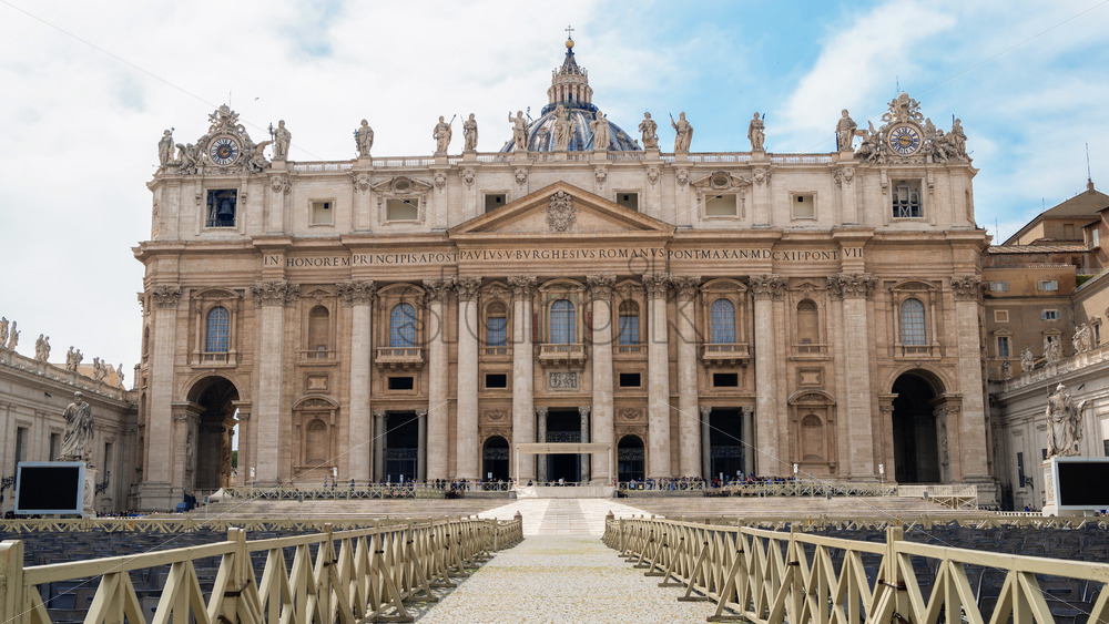 VATICAN CITY – JUNE, 2022: View of the Saint Peter Square with Saint Peter Basilica and seats in front of it. Multiple tourists near the entrance