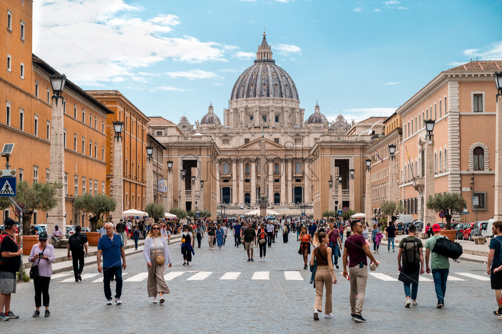 VATICAN CITY – JUNE, 2022: View of the Saint Peter Square with Saint Peter Basilica and the Vatican Obelisk in the distance. Multiple tourists walking on the Via della Conciliazione