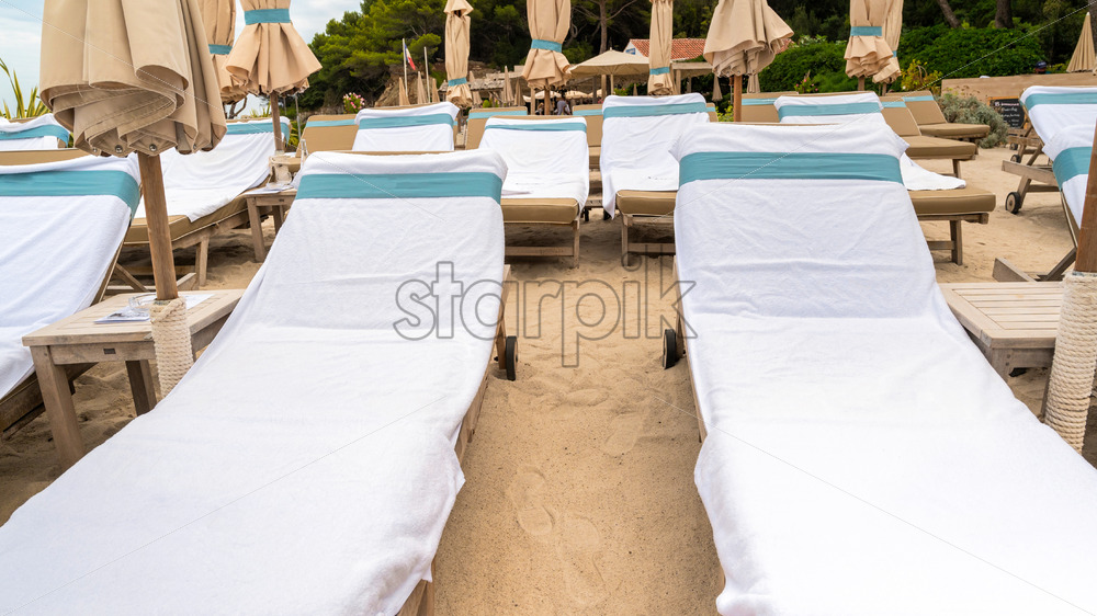 View of the Mediterranean sea coast with sunbeds and umbrellas on the Island of Sainte-Marguerite, France